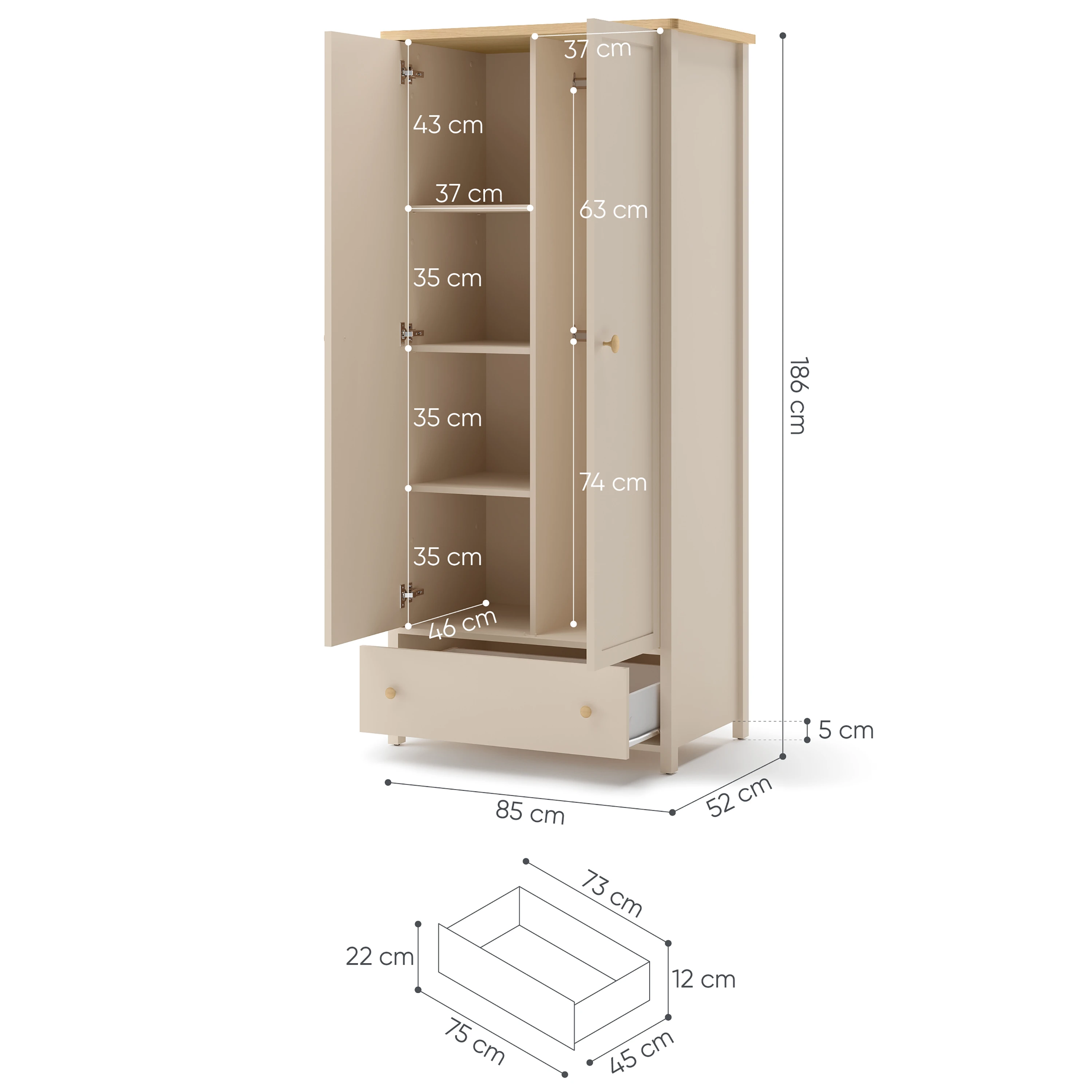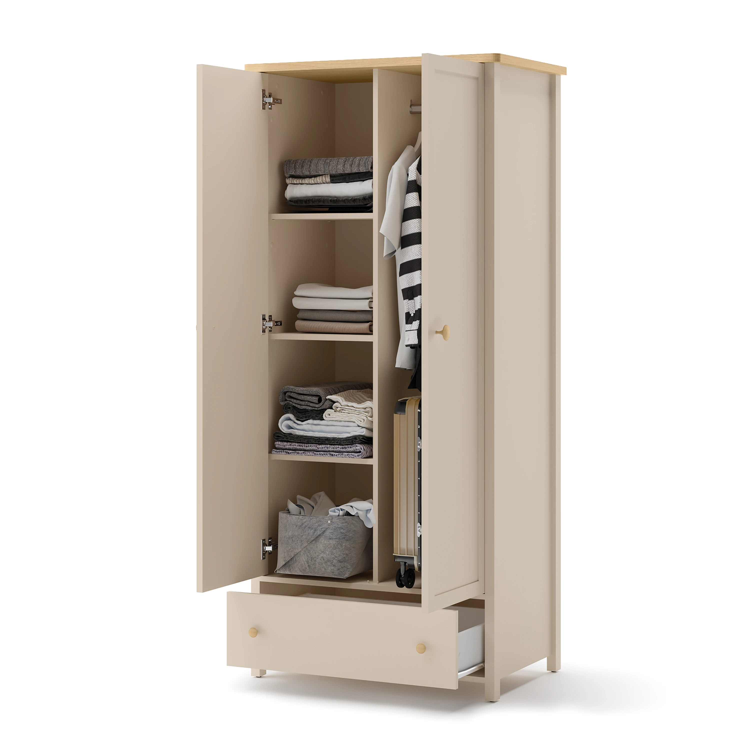 Wewnątrz szafy znajdziesz długi drążek, na którym możesz zawiesić odzież o różnej długości. Na dole zaplanowano szufladę – pojemną i łatwo dostępną. Dodatkowe miejsce do przechowywania znajduje się pod drążkiem.