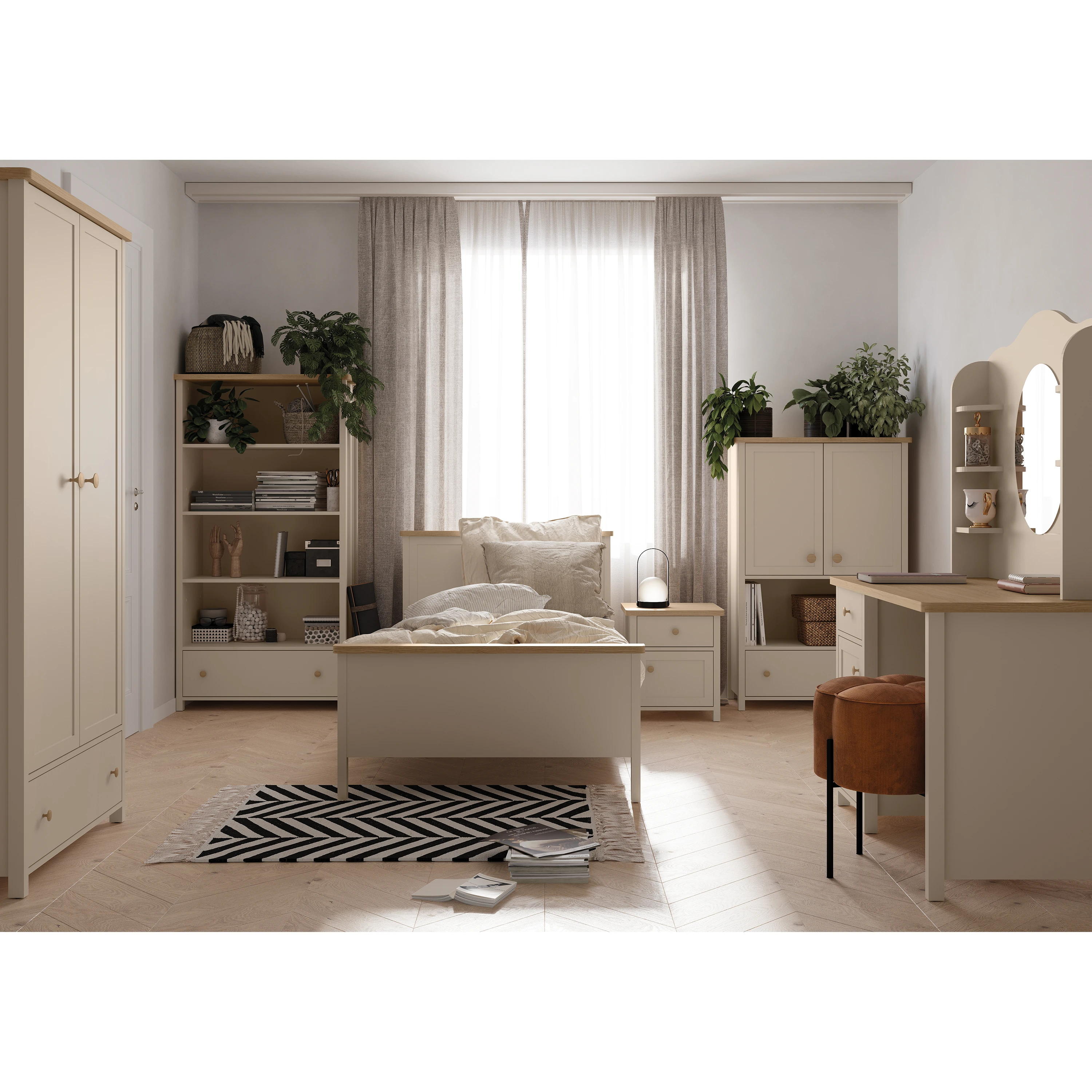 Szafa STORY wyróżnia się oryginalnym charakterem. Smukła bryła w kolorze ej bieli i detale o barwie drewna tworzą niepowtarzalny styl, który spodoba się mniejszym i większym romantyczkom.